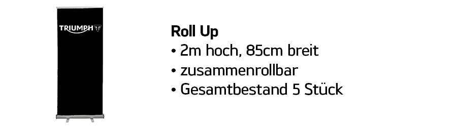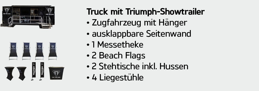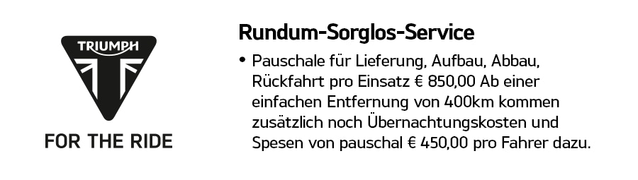 Herzlich Willkommen beim online Buchungstool der Triumph Motorrad Deutschland GmbH. Hier können Sie Veranstaltungsequipment konfigurieren und anfragen.